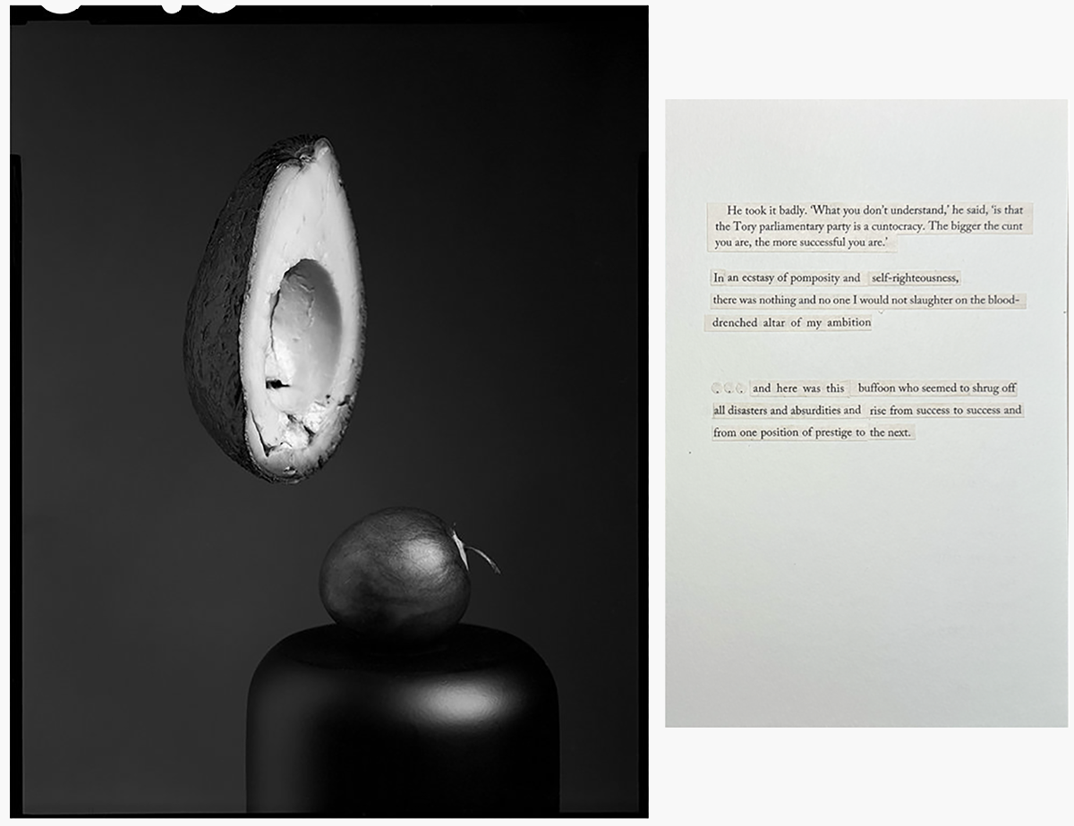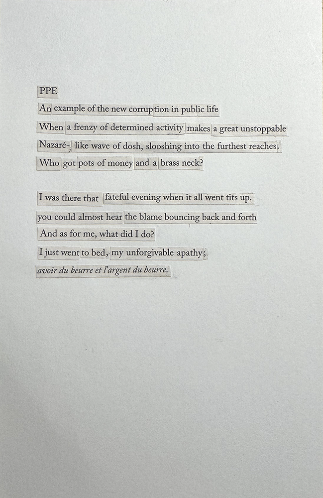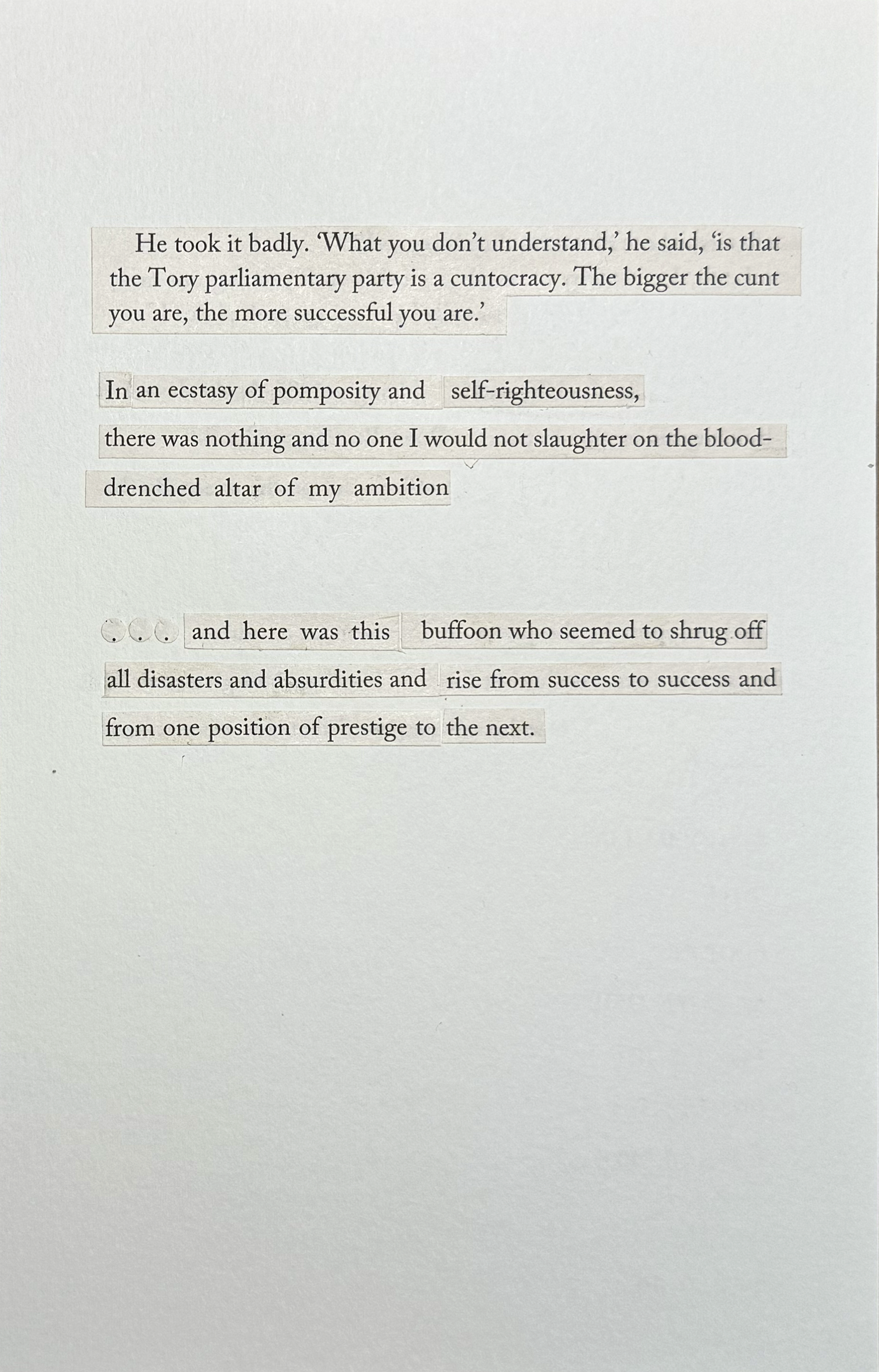 The artist’s view of the conceit and deceit in the political world, by re-contextualising memoirs, newspaper and magazine articles, from Brexit and Covid through to the expenses and sex scandals.