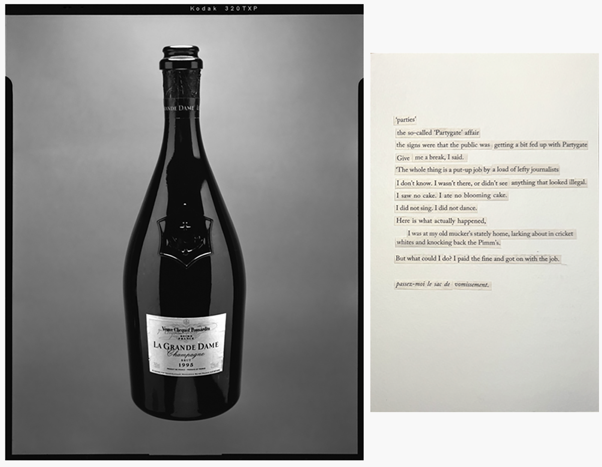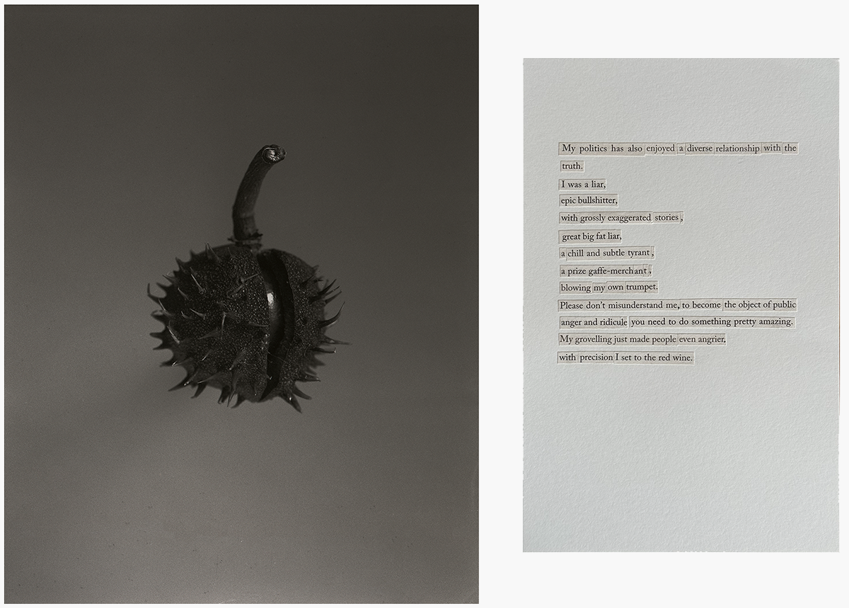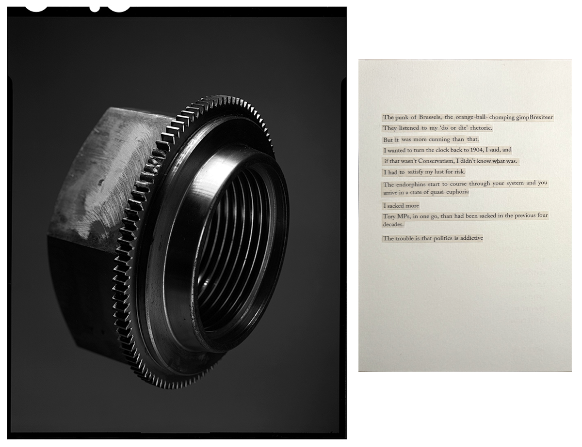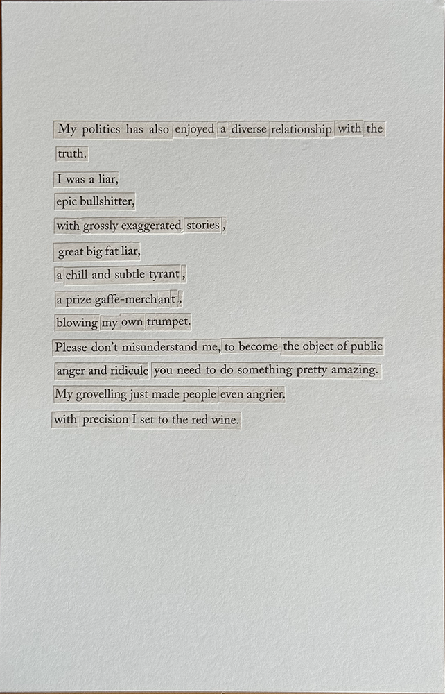The artist’s view of the rhetoric and deceit in the political world, by re-contextualising memoirs, newspaper and magazine articles, from Brexit and Covid through to the expenses and sex scandals.